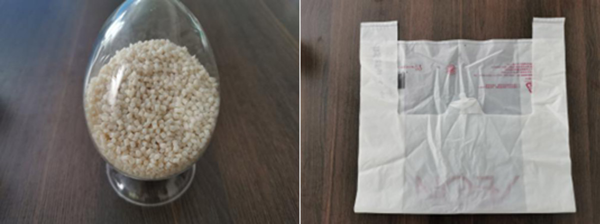 BF1112产品主要成分是PLA、PBAT和淀粉,其制品能够在使用废弃后100%生物降解,最终生成二氧化碳和水,不污染环境。该类产品由于大比例淀粉添加价格相对便宜,其力学性能和使用上能够满足常规包装袋膜材料要求,并且降解速度快、价格低。该产品具有良好的加工性能和物理性能,可以直接用于吹膜加工制成各类薄膜制品,如购物袋、手提袋、快递袋、垃圾袋、抽绳袋等。