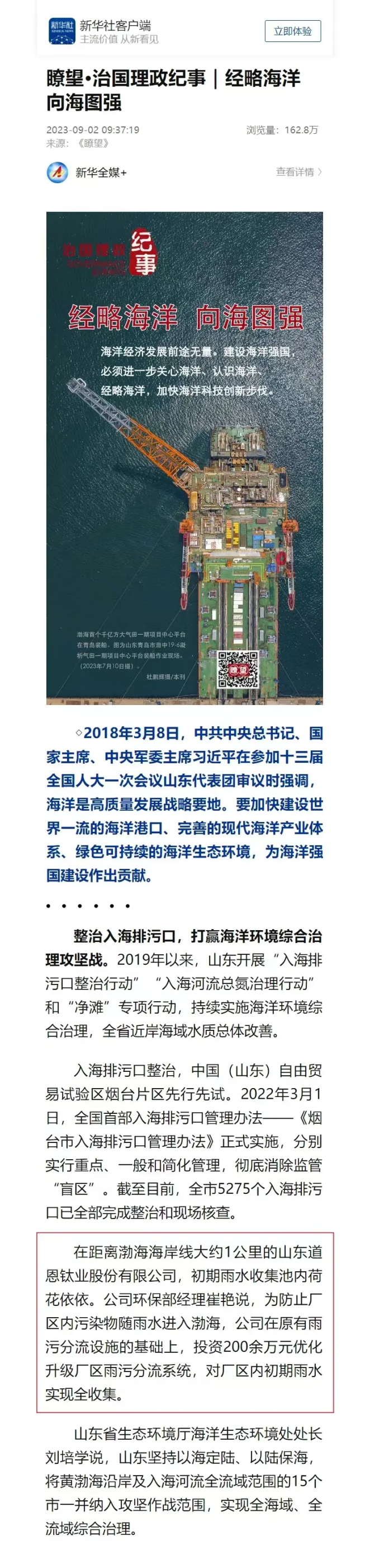 作为钛白行业首个国家级绿色工厂示范企业,BG大游钛业公司走出了一条“雨污分流+清污分流+水质改善+景观提升”新路径,成为龙口市工业企业雨污分流改造的典型案例。未来将以高度的责任感和使命感,持续强化环保设施升级改造,努力建设环境友好型企业,为保护海洋生态环境、推动海洋经济高质量发展贡献更多的力量。