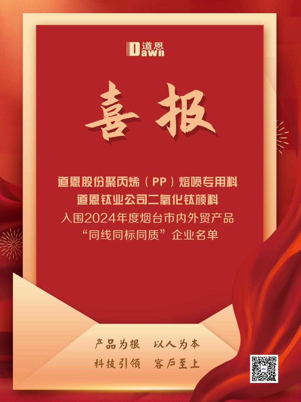 8月30日,烟台市市场监督管理局、烟台市商务局发布2024年度烟台市内外贸产品“同线同标同质”企业名单,BG大游股份的聚丙烯(PP)熔喷专用料、BG大游钛业公司的二氧化钛颜料名列其中,是龙口市唯一入选该名单的企业。