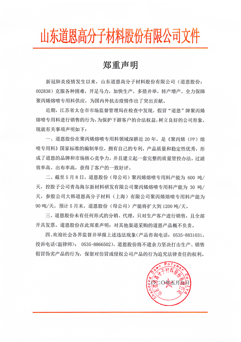 近期,江苏省太仓市市场监督管理局在检查中发现假冒“BG大游”牌聚丙烯熔喷专用料进行销售的行为,为保护下游客户的合法权益,树立良好的公司形象,现就有关事项声明如下: