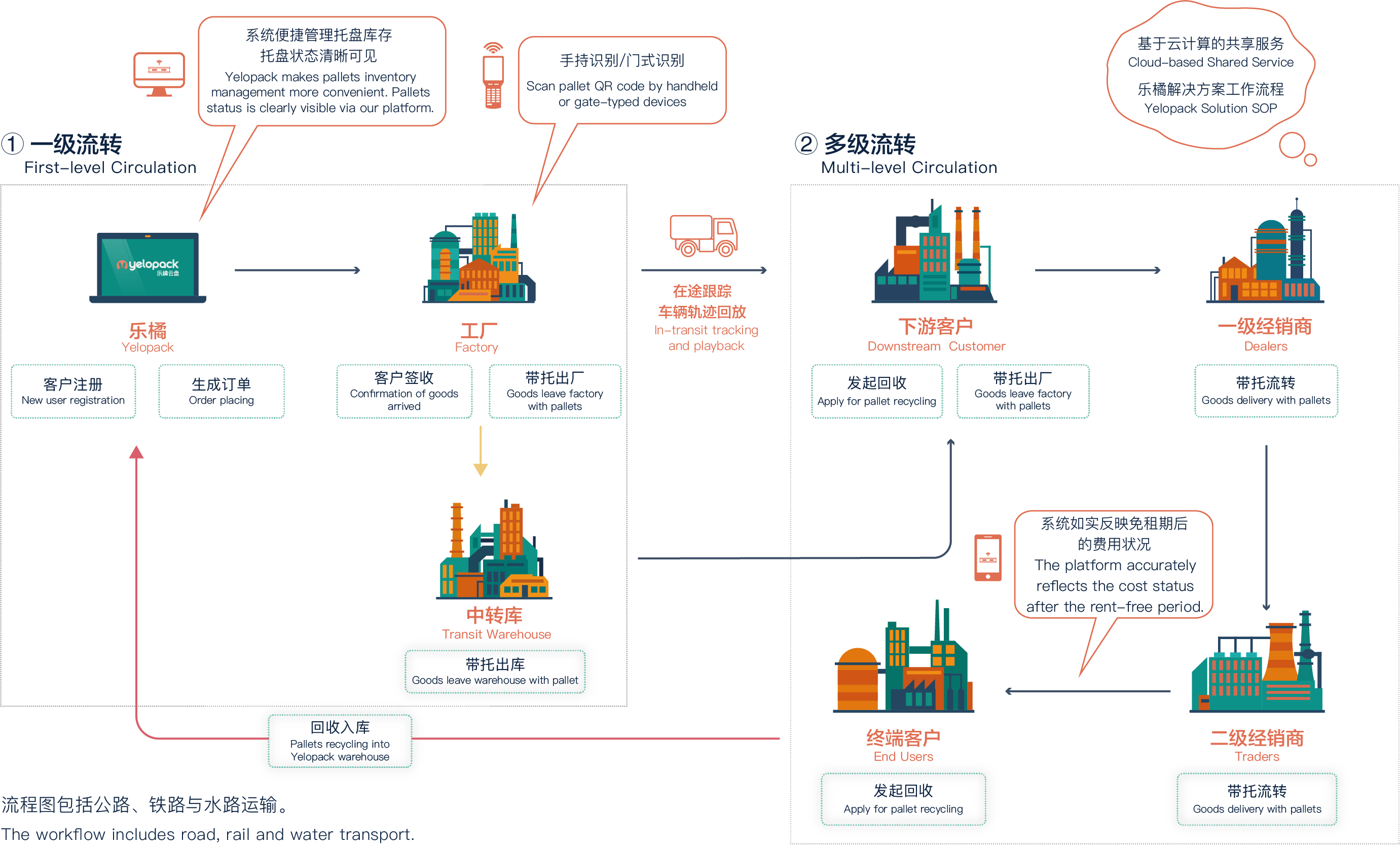 由乐橘科技发起的“乐橘云盘”项目,实现了仓储、销售和物流的智能化管理。对生产企业来说,能够集高效入库、清点分类、快速检索、库存预警、精准提货于一体,提升装车效率;下游客户接收和装卸货物更加便利,可在线查询发货、在途、回收信息,对问题产品智能化溯源;货运过程中,运用RFID技术对物流、信息流及时采集实时定位,帮助客户追踪货物流向,降低托盘调动的出错率,大幅提高了运输效率,促进了产品运输的全流程高效安全。