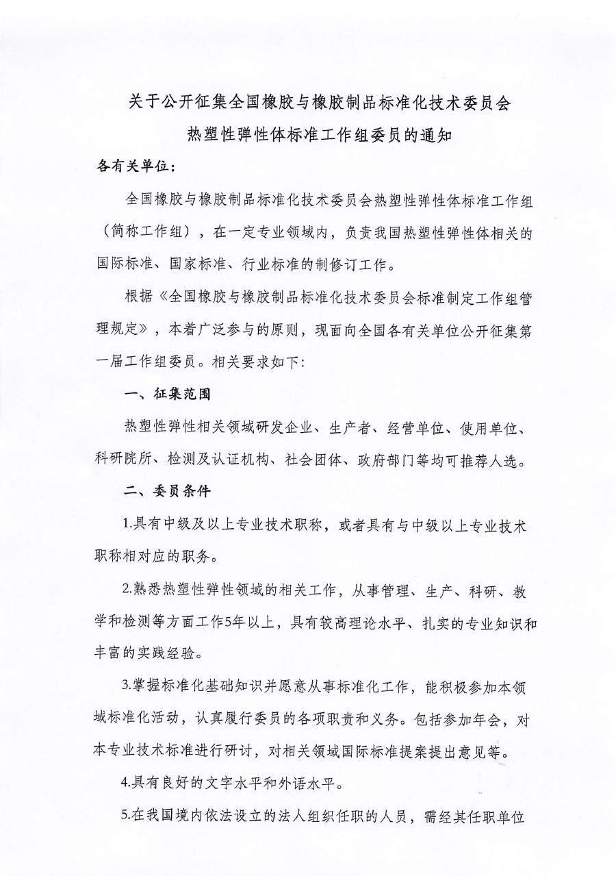 热塑性弹性相关领域的研发企业、生产者、经营单位、使用单位、科研院所、检测及认证机构、社会团体、政府部门等均可推荐人选。