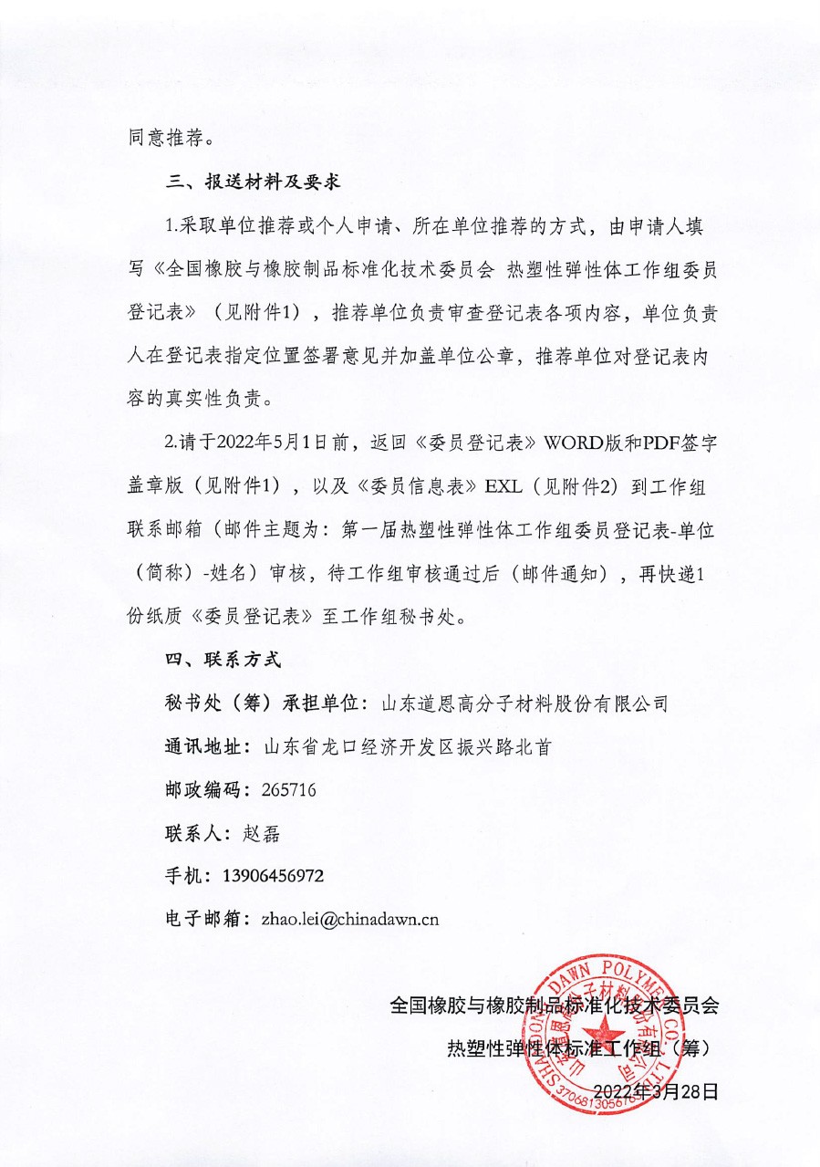 2.请于2022年5月1日前,返回《委员登记表》WORD版和PDF签字盖章版(见附件1),以及《委员信息表》EXL(见附件2)到工作组联系邮箱(邮件主题为:第一届热塑性弹性体工作组委员登记表-单位(简称)-姓名)审核,待工作组审核通过后(邮件通知),再快递1份纸质《委员登记表》至工作组秘书处。