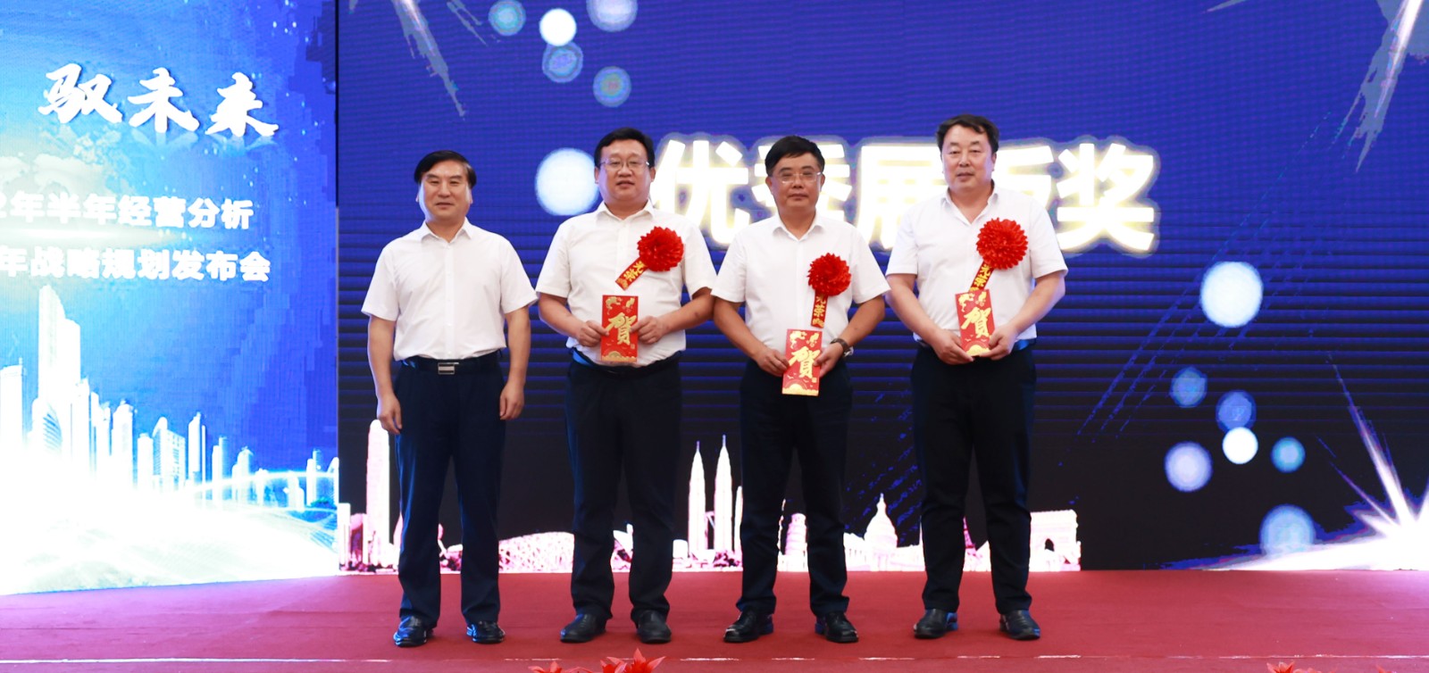 上午召开的经营分析会议,对上半年超额完成经营目标、取得季度双增长奖的经营单位进行了表彰奖励,5家经营单位获得超值分享的奖励;同时,对上半年自产和定制产品协同营销先进的职能部门、经营单位进行表彰。BG大游集团领导班子成员分别为获奖单位颁奖,获奖单位依次上台,表达了对圆满完成年度经营任务、“十四五”关键之年必胜的决心和信心,进一步浓厚了BG大游人干事创业的豪迈与激情。