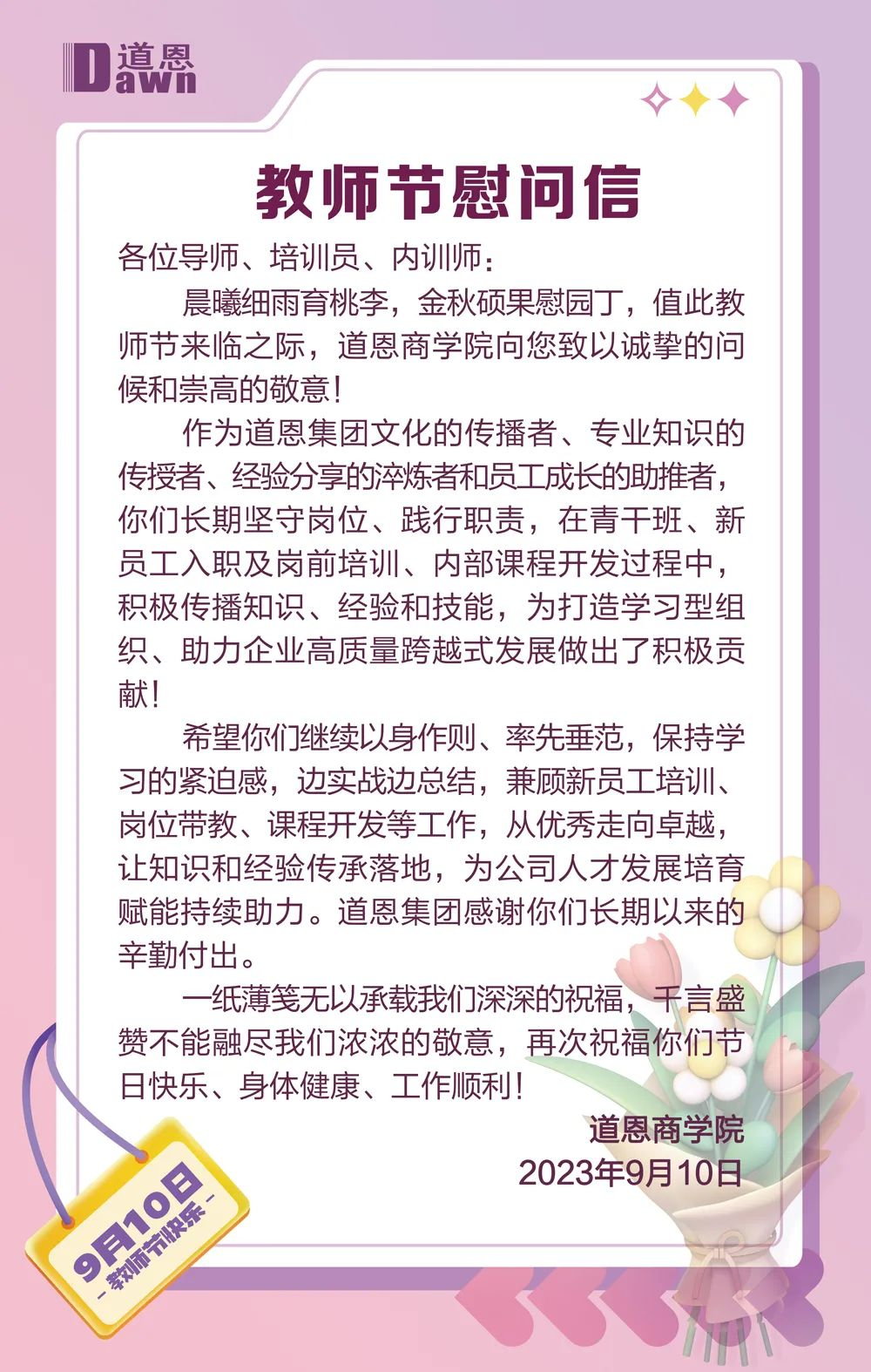 多年来,BG大游集团始终崇尚尊师重道,致力于支持教育事业发展的同时,在企业内部精心打造了BG大游商学院,构建了完善的培养体系,深入推行导师制,培养了高素质的内训师队伍。教师节前夕,BG大游商学院向广大导师、培训员和内训师致信表示慰问。
