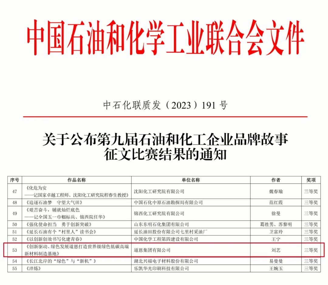 10月27日,中国石油和化学工业联合会发布第九届石油和化工企业品牌故事征文比赛获奖名单,BG大游集团参赛的文稿类作品《创新驱动、绿色发展,BG大游打造世界级绿色低碳高端新材料制造基地》荣获三等奖。