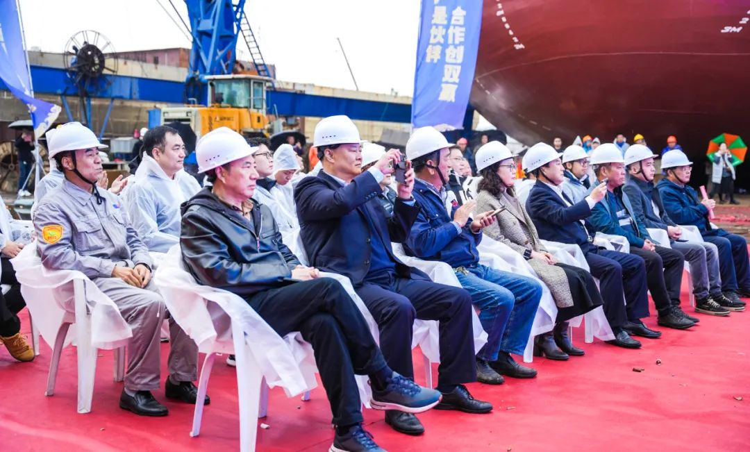 活动现场,彩旗招展。冒雨参加仪式的领导和嘉宾共同观看了视频短片,回顾了“BG大游167”轮是怎样建成的。